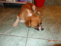 At the end of the last month Adela (is how we called her) was by herself in the streets at the end of a village. We were trying to capture a white and furry but very scared puppy dog and while we were calling for the puppy we found ourselves with Adela in our arms. It was impossible for us to leave her there so we took her, we neutered her and now she is sheltered at one of our volunteers.