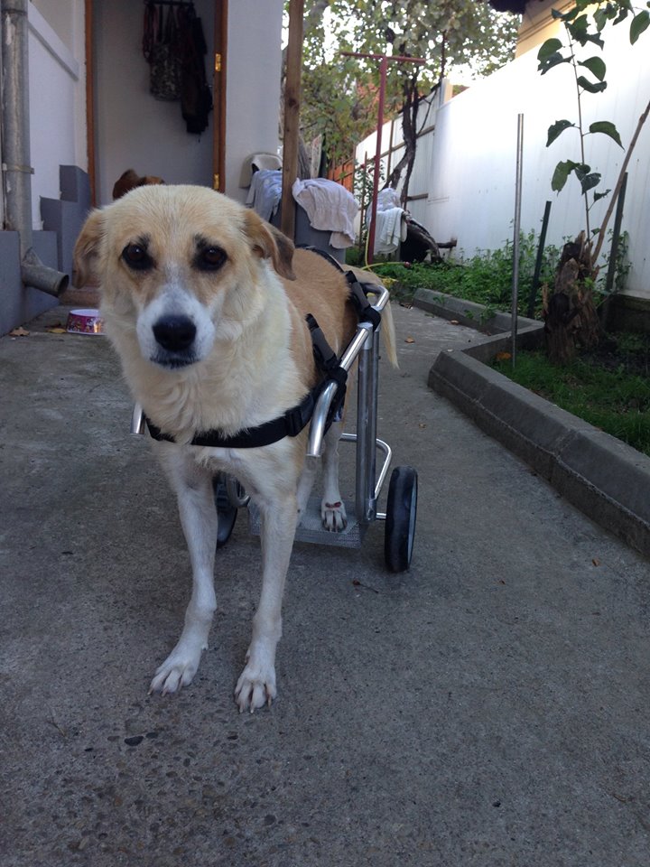 Greaty is a normal dog that cannot go out for walks without the help of her wheelchair. She likes to stay outside (in a yard) when is sunny and nice weather she stays out almost all day long. Inside the house she is a good dog, she sleeps all night long and likes to have her little “crib” with blankets and dog pads. She is sociable, at the moment she lives with other 3 dogs. She stays alone at home for 5 hours, so she doesn’t need non-stop surveillance. Unlike a dog that has no moving problems, she needs to be cleaned more often for hygienical reasons and needs any kind of healing creams for the small wounds that appear on her back legs because of the crawling.