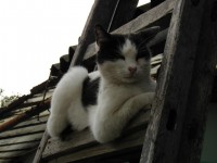 Cateodata se joaca cu mine de-a alergatul si sincer mi-e cam frica de ea asa ca o sasaii de cate ori se apropie si asta o infurie si prinde viteza si mai mare. Dar am gasit leac pentru dumneai. Priviti ce loc bun am gasit. Acum Dasha se uita in zadar dupa mine si-n plus de-aici pot s-o sasaii cat vreu dar n-o fac pentru ca sunt un motanel inteligent si nu-mi pun mintea cu ea.