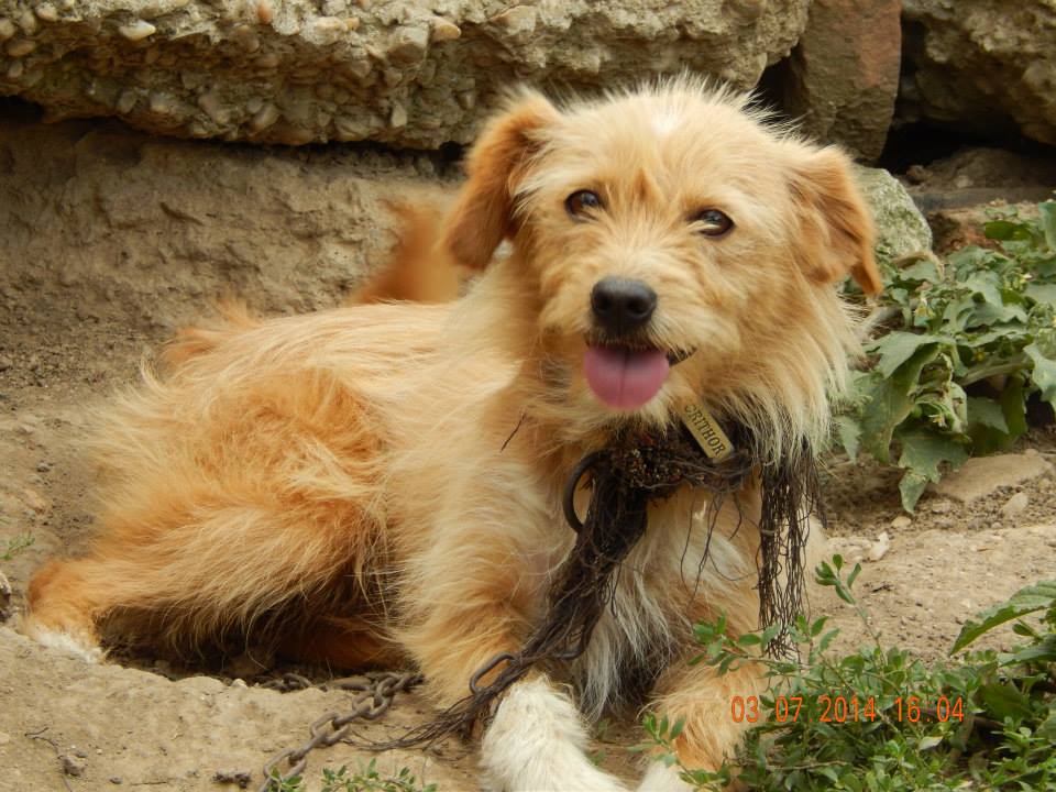 Acest catelus are ca varsta un an si jumatate si inca decand era doar un pui a fost adoptat de o familie din mediu rural. Cainele nu e sterilizat, nici vaccinat, mai mult ca sigur nedeparazitat, dupa cum vedeti mult timp e tinut legat si in filmuletul din link-ul de mai jos veti vedea in ce vase isi primeste mancarea.