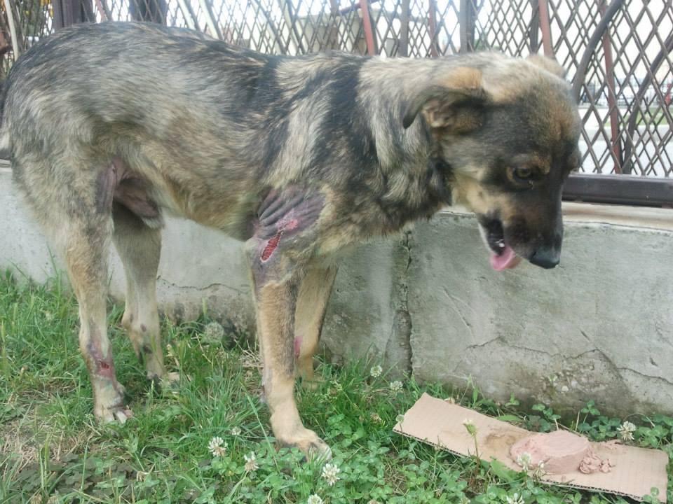 Dupa pozele printate pe care i le-am aratat de cand catelul avea ranile deschise, dna doctor ne-a spus ca cel mai probabil catelul nu a fost muscat de alti caini, ci a fost calcat de o masina mare care l-a prins sub roti si la tarait de astfalt. Ne-a spus ca forma lunga a ranilor indica acest lucru. In plus ne-a explicat ca daca ar fi fost atacat de caini ar fi trebui sa aiba rani in jurul gatului, in nici un caz pe picioare. Eu eram in concediu atunci si asa mi-a zis portarul cand l-am intrebat ce a patit catelul. Probabil ca nici el nu stia exact, incidentul petrecandu-se noaptea.