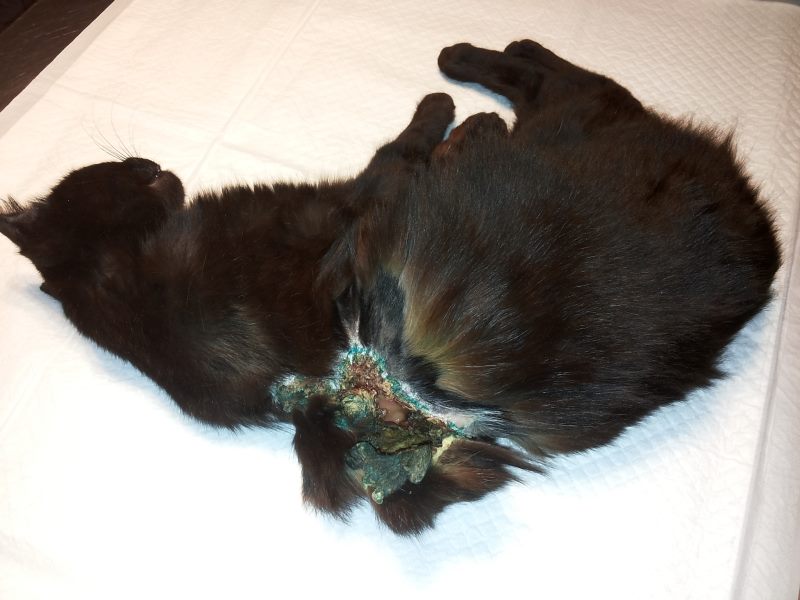 Deocamdata a primit hrana buna si a fost cazat, iar maine dimineata la prima ora vom fi cu el la veterinar. Trebuie sa-i fie indepartata bucata mare de piele moarta si ramane de vazut care e situatia dedesubt.