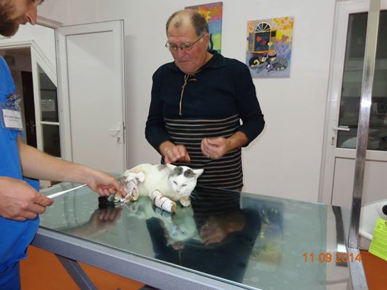 Pentru ca l-am ajutat si in altfel de situatii dl Habor ne-a cerut ajutorul in acest caz. Distanta fata de Bucuresti era mare si am stabilit sa-l trimita a doua zi cu o cursa pana in Militari. Intre timp i-au acordat chiar ei asa cum s-au priceput un prim ajutor. I-au dezinfectat ranile, i le-au cusut, i-au pus atele, l-au bandajat. Motanul insa plangea incontinuu si se uita la salvatorul lui asa ca acesta OM la 65 de ani n-a mai stat pe ganduri s-a urcat in masina si a pornit o cursa contra cronometru de undeva dintr-o comuna de langa Rm Valcea pana la Bucuresti. A reusit sa ajunga in jurul orelor 22 timp in care a fost asteptat peste program la Clinica Veterinara Dr. Bercaru