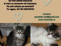 Fluffy, the grey cat, and Soft, the black and white tomcat, were abandoned some while ago. They were lucky because a lady with a big heart took them and raise them with a lot of love. These naughty little one are now big and beautiful and ready for adoption. We hope that they will be adopted together. Contact:asociatia.robi@gmail.com