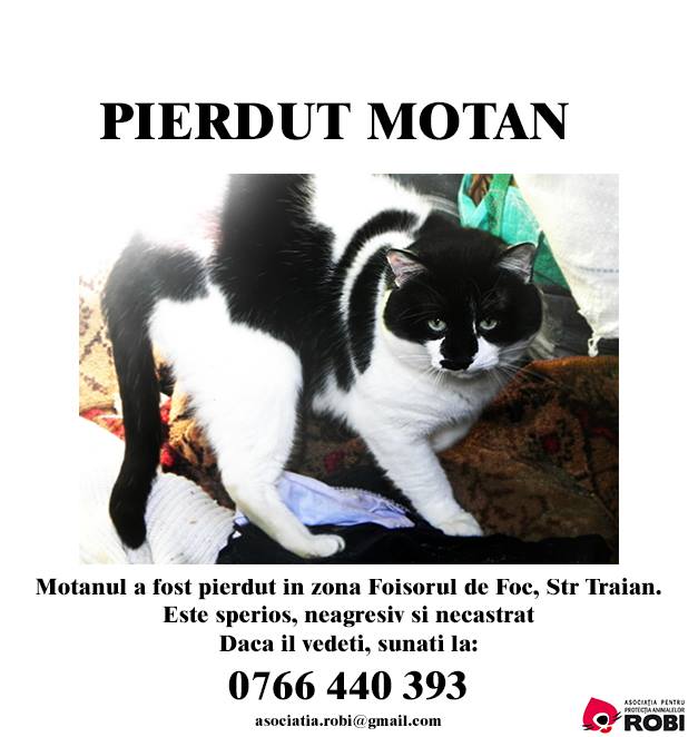 Motanul s-a pierdut azi, 27.03.2014 in zona Hala Traian, str Traian. Este necastrat, sperios dar neagresiv. Are aprox 4 ani. Il cheama Floricel.
