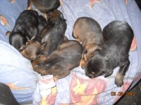 Seven puppies, 2 weeks old, with a lot of flees were left on the field in the grass. When we found them they were crying their heart out.