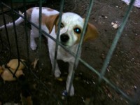Small, alone, abandoned in front of a supermarket, this tiny girl of only 3-4 months is in great risk to end up in front of the speeding cars that pass only a few meters from the pen with old rags and cardboards where she was abandoned, and from where she can easily get out of. A homeless woman feeds her from time to time. The little girl wags her tail every time somebody looks at her, but the rain makes her run back in her cardboard box.