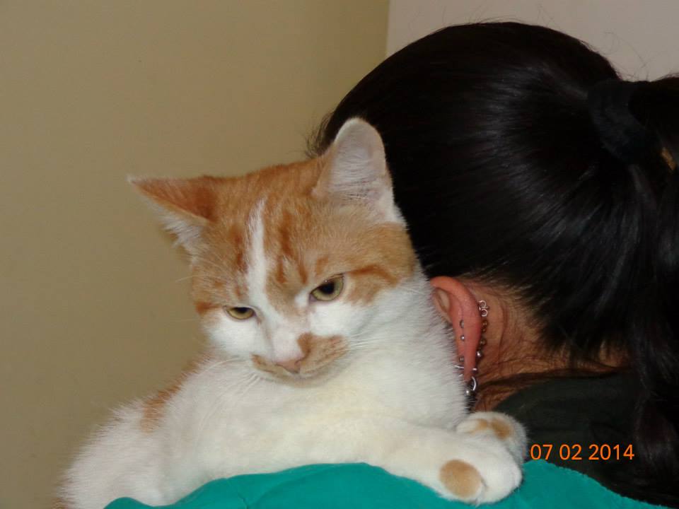 „povestea lui (pentru ca trebuie sa aiba o poveste) este ca a fost aruncat din casa pe cand avea 2-3 luni si a supravietuit ascunzandu-se in ghena din spatele blocului. Norocul lui a fost ca femeia de serviciu a avut grija de el si i-a dat sa manance resturi de mancare. Cu toate necazurile, el a ramas un pisic foarte prietenos cu oamenii, iesind in intampinarea lor de fiecare data cand ieseau din scara blocului. Cand a venit iarna, i-a fost facuta o casuta de carton in care sa se adaposteasca, dar niste oameni rai i-au stricat-o, asa ca el a stat in frig pe scarile blocului si a racit destul de rau, pana cand a fost salvat si adus la clinica”