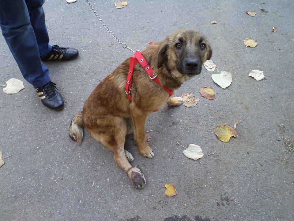 “A few days ago, I saw a puppy in my way to work. I was shocked by the way he looked like… it was obvious that he had been tortured… he had his tail cut off… the back paw was useless.. he was practically dragging it… it was very swollen. Banuiesc ca are nevoie de o operatie..tratament…eu i-am dat antiinflamator pentru durere..dar nu-mi permit sa pot plati o operatie si de tratamentul de care banuiesc ca are nevoie. Va rog frumos sa ma ajutati…sa-l ajutati sa traiasca si sa nu se mai chinuie. Cu tot ce a patimit inca are incredere in oameni si nu fuge cand te duci spre el..este foarte bland si are nevoie de multa atentie si iubire .Sta in fata scarii unui bloc si mi-e teama sa nu pateasca ceva mai rau…sunt atat de multi oameni rai sau poate fi luat de hingheri…nici nu se pune problema sa poata fugi.’
