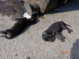 Azi dimineata acesti catelusi nou nascuti traiau. Au fost pusi la umbra de catre boschetarul din imagine dar dupa spusele lui copii i-au luat s-au jucat cu ei si i-au lasat in plin soare. Micutii au plans toata ziua fara ca cineva sa le dea o mana de ajutor. S-au uitat la ei cum mor. Am ajuns la ei cautand o alta catelusa gestanta pe care am vazut-o intamplator in zana respectiva si pe care din pacate n-am gasit-o. Micutii erau morti si pentru ei nu se mai putea face nimic.