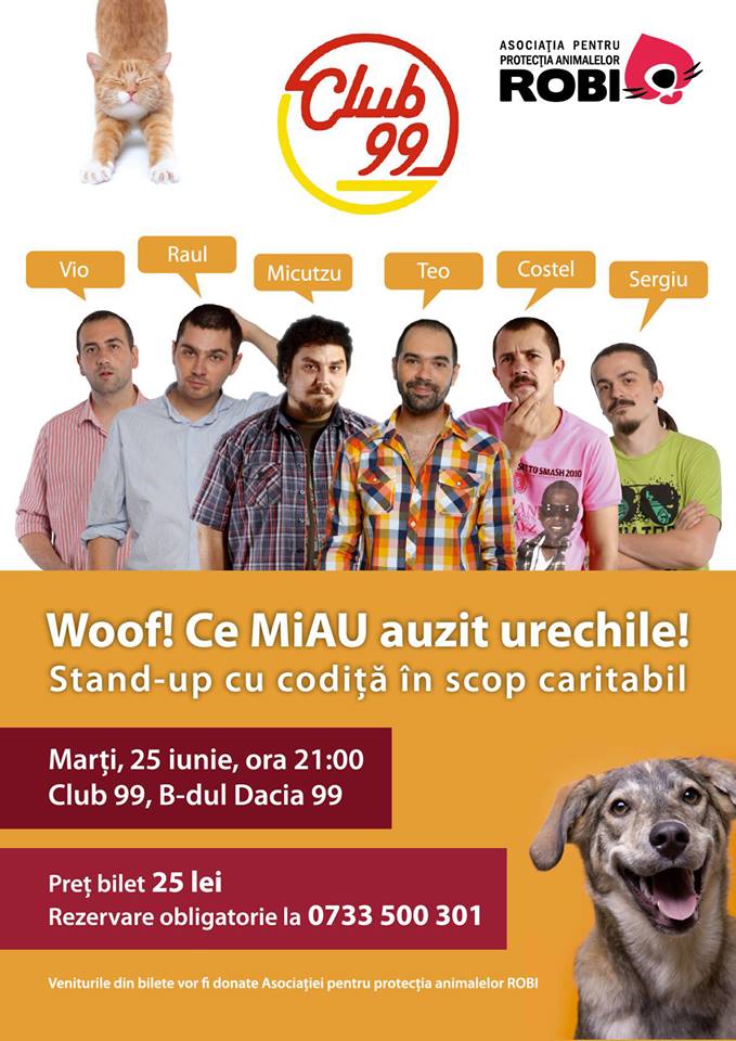 stand upAsociaţia pentru protecţia animalelor ROBI, together with an extraordinary team of young comedy actors, including Vio, Raul, Sergiu, Micuţu, Teo and Costel, is organizing a special stand-up comedy evening for charity.