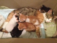 The mother cat and her five kittens were found in a box in the middle of a street. They were sheltered first in the yard of a block of flats, then in a toilet room, but, obviously, they cannot stay there for long. The mother is very friendly and grateful, and her eyes look like a deer’s. She started to purr the moment she was caressed, it was, no doubt, her way of showing gratitude to the lady who saved her family and took care of it.