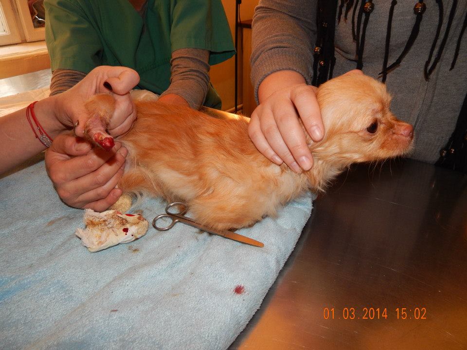 Salvatorii ei au dus-o din nou vet si vazand ca n-o scot la capat nici macar punandu-i micutei un guler care ar fi trebuit s-o impiedice sa-si mai raneasca labutele, ne-au solicitat ajutorul. Pentru ca nimic nu parea sa dea roade am decis sa o luam la noi in ideea ca fiind in compania altor animale micuta va uita de stres si nu-si va ma roade labutele.
